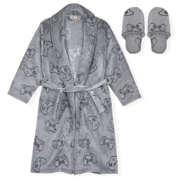 Sleep On It Boys Plush Flannel Fleece Collar Robe Set with Matching Slippers - Gaming