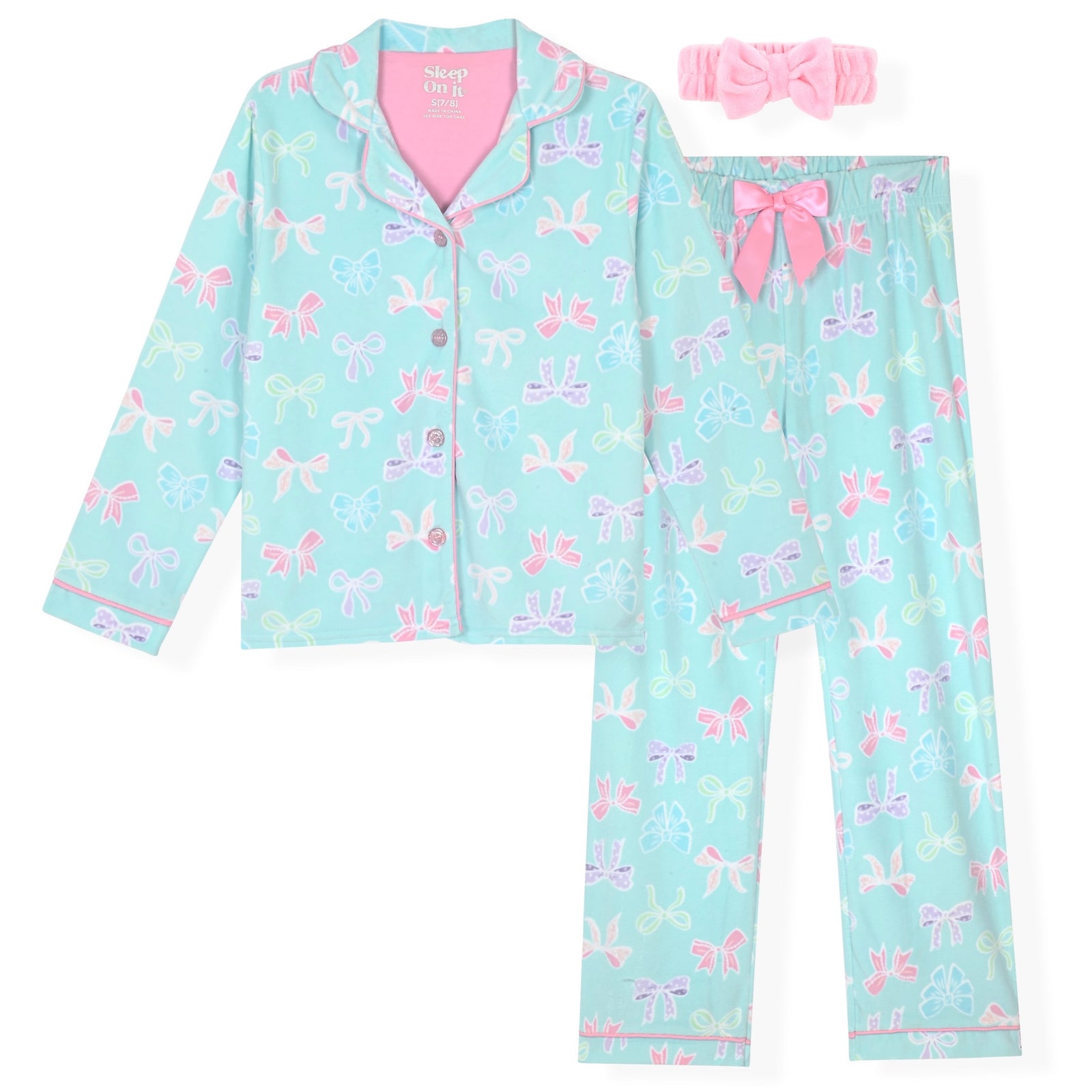 Sleep On It Girls 2-Piece Long-Sleeve Button-Up Pajama Set with Plush Headband Gift, Big Bows