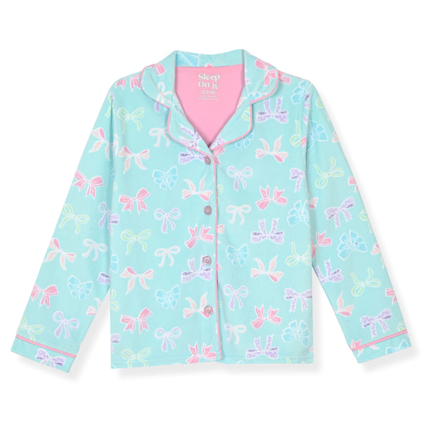 Sleep On It Girls 2-Piece Long-Sleeve Button-Up Pajama Set with Plush Headband Gift, Big Bows