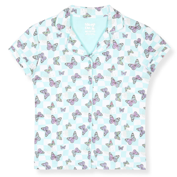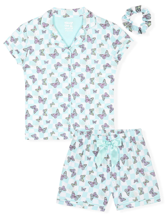 Sleep On It Girls 2-Piece Short-Sleeve Button Down Collared Coat Pajama Set with Matching Scrunchie - Butterfly