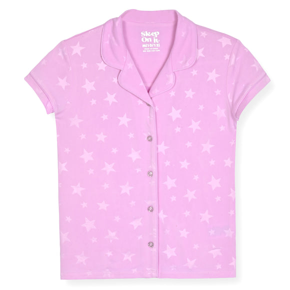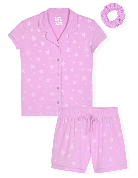 Sleep On It Girls 2-Piece Short-Sleeve Button Down Collared Coat Pajama Set with Matching Scrunchie - Embossed Stars