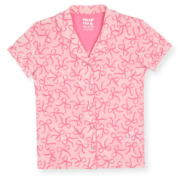 Sleep On It Girls 2-Piece Short-Sleeve Button Down Collared Coat Pajama Set with Matching Scrunchie - Pink