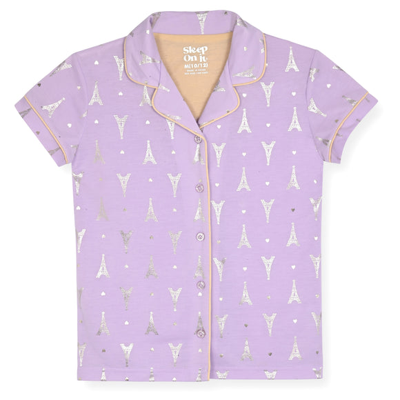 Sleep On It Girls 2-Piece Short-Sleeve Button Down Collared Coat Pajama Set with Matching Scrunchie - Paris Foil