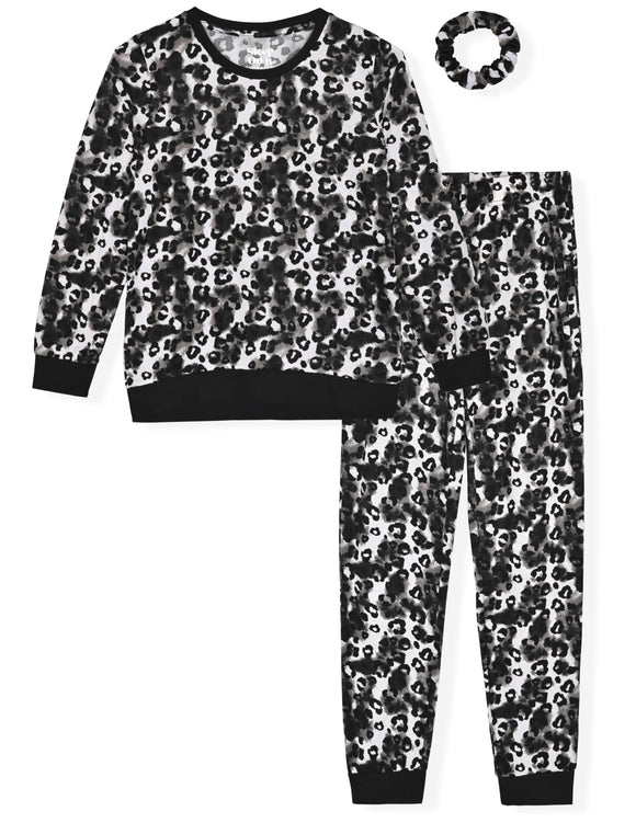 Sleep On It Girls 2-Piece Long-Sleeve Button-Up Pajama Set with Plush Headband Gift, Cheetah