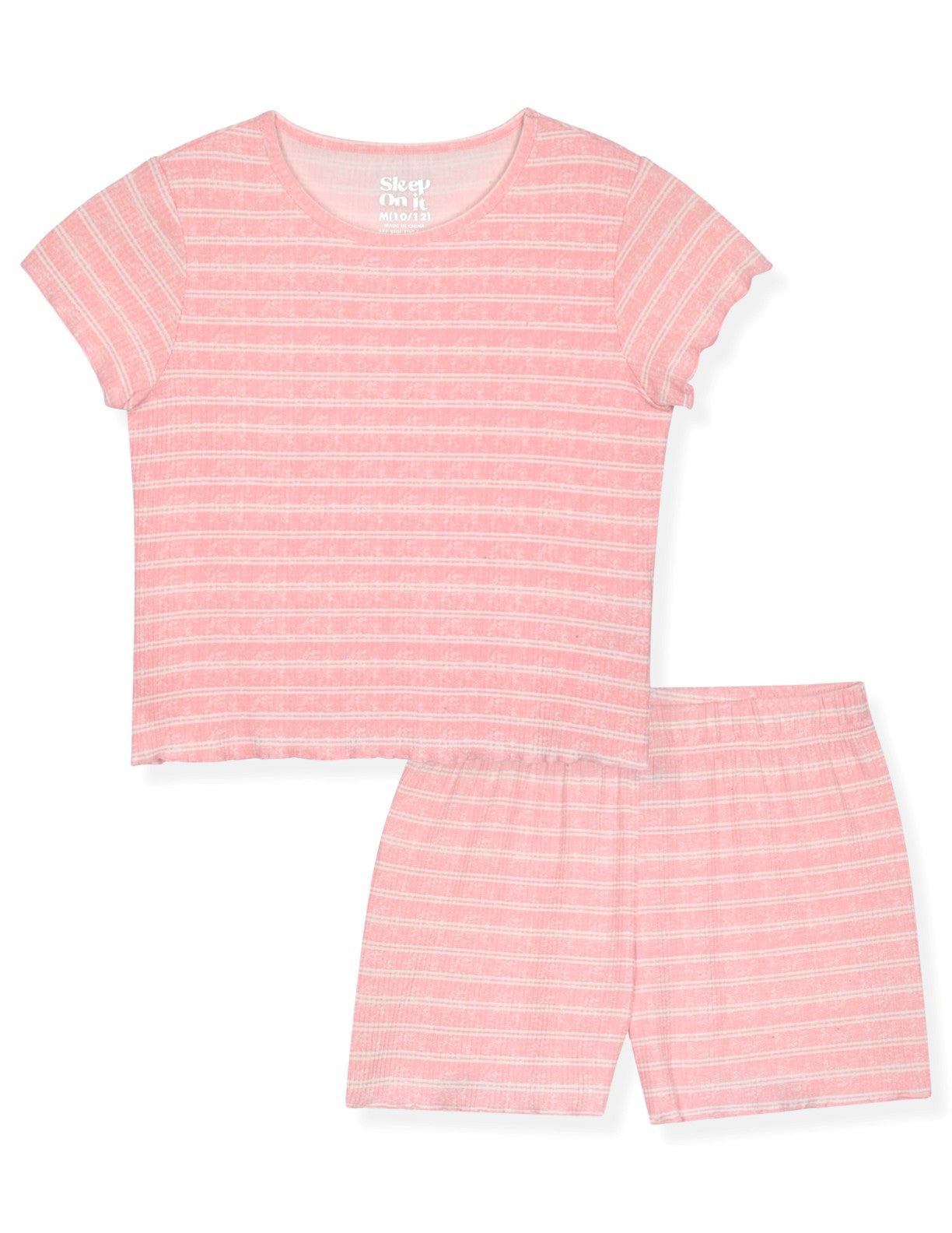 Sleep On It Girls 2-Piece Short Sleeve Pajama Shorts Set – Ribbed Milky Jersey or Pointelle Knit - Pink Stripe