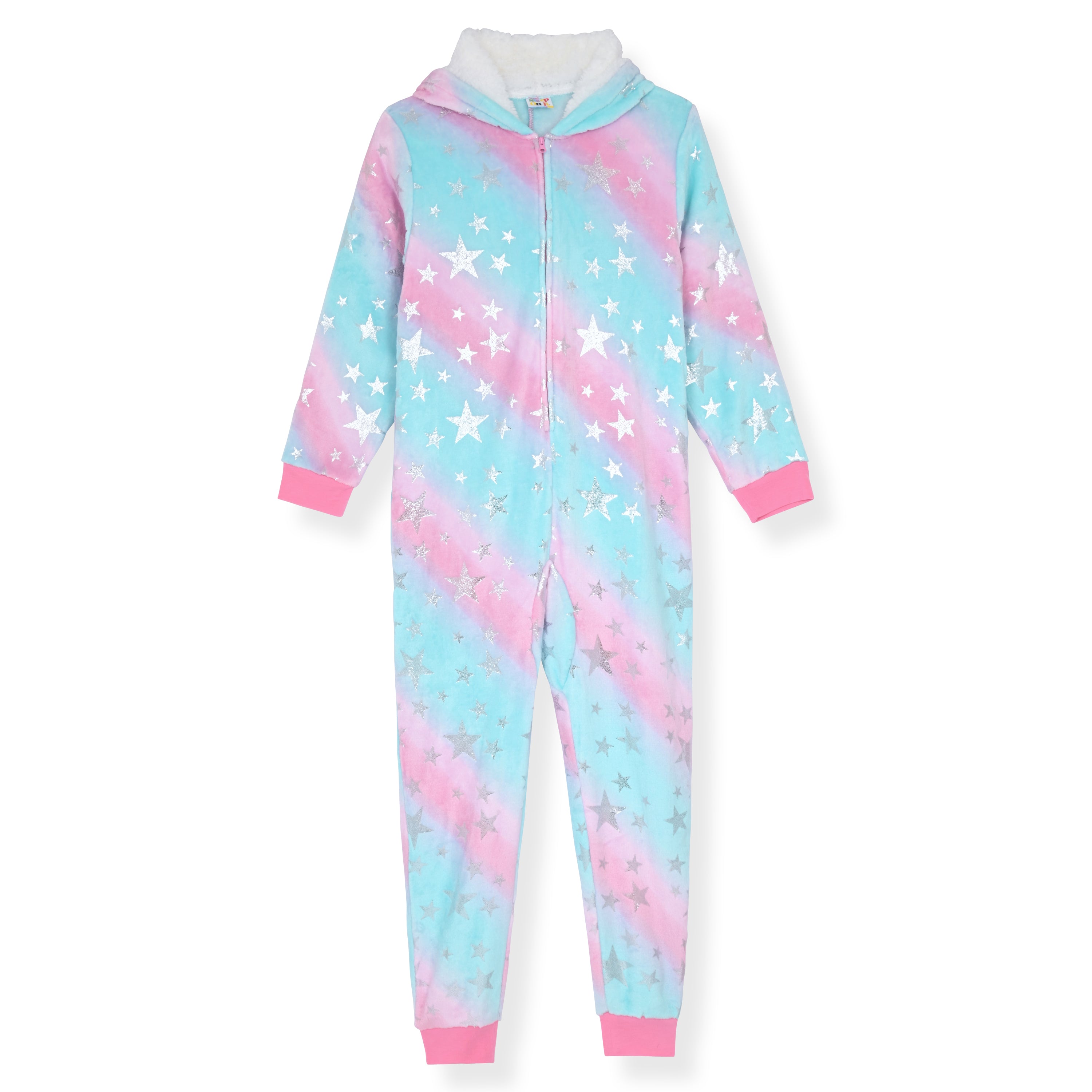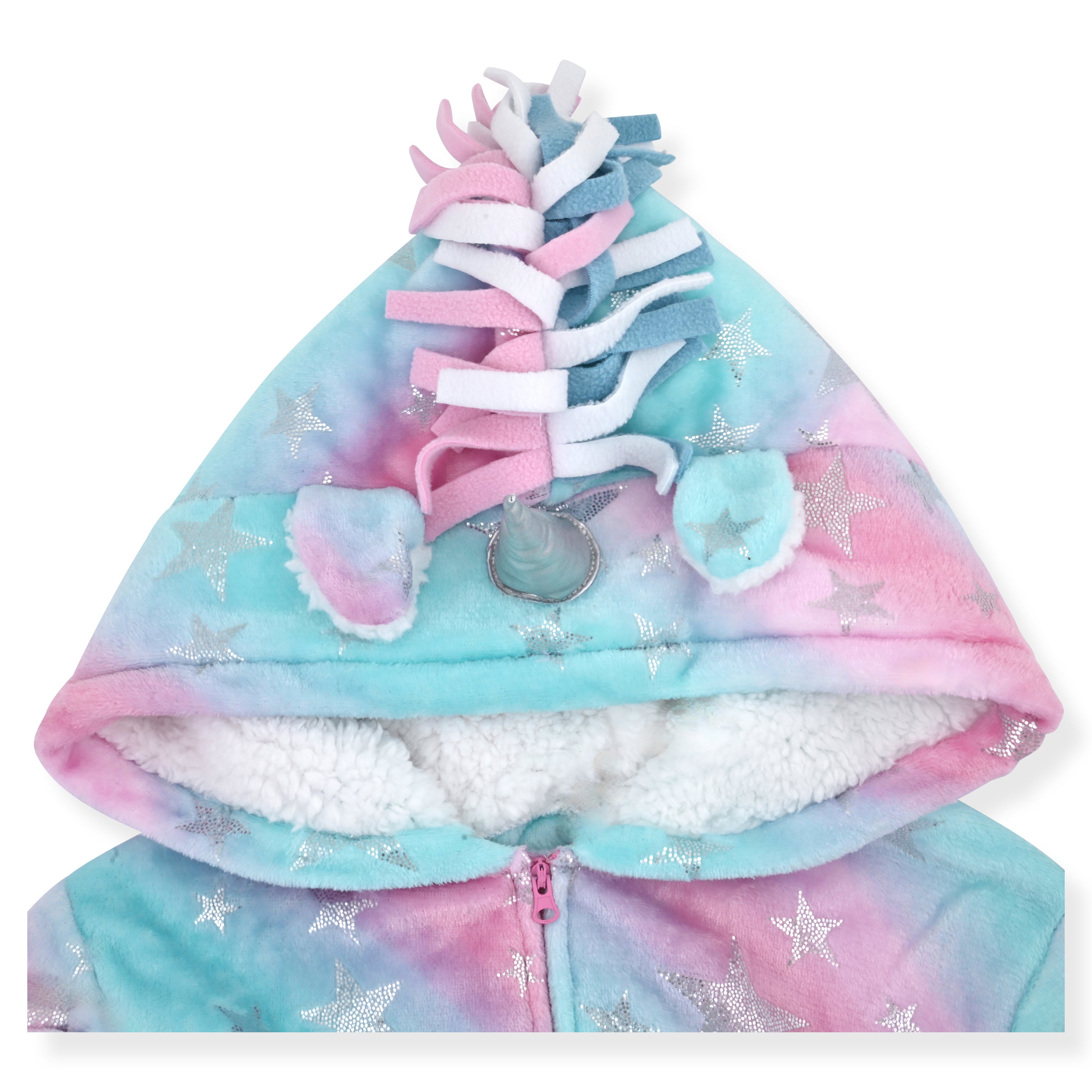 Each onesie features a full front zipper, cuffed sleeves and ankles, and fun design details—like cheetah print texture or a rainbow unicorn hood with 3D ears and horn. The sculpted or foil star fleece adds a touch of sparkle while staying incredibly soft to the touch.