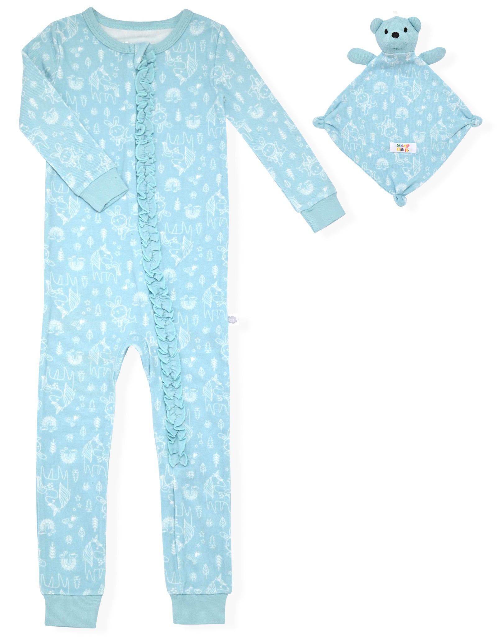 Girls Long Sleeve Super Soft Snuggle Jersey Zip-Up Coverall Pajama with Blankey Buddy- Animal Wonderland.