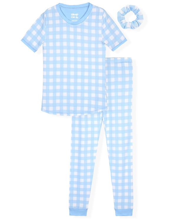 Sleep On It Girls 2-Piece Super Soft Jersey Long Sleeve Snug-Fit Pajama Set for Toddlers & Girls with Scrunchie - Checkerboard