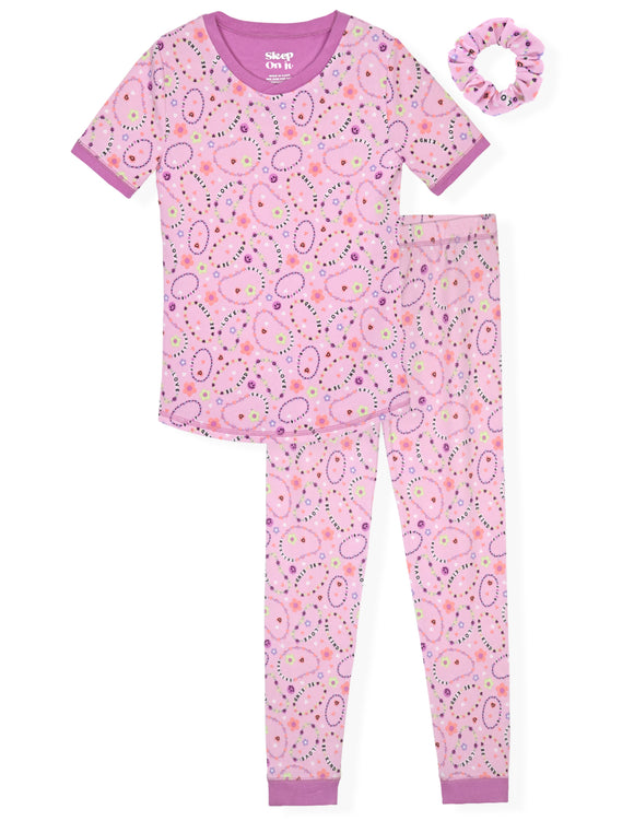 Sleep On It Girls 2-Piece Super Soft Jersey Long Sleeve Snug-Fit Pajama Set for Toddlers & Girls with Scrunchie - Hearts