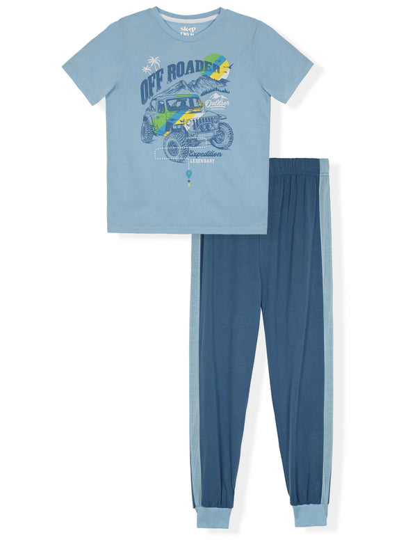 Are you ready to rev up the fun at bedtime? Because with Sleep On It's trendiest collections, your little one will be all set with some stylish comfort that will have them snooze off into dreamland faster than ever before. We, at Sleep On It, believe that bedtime must be filled with the best of dreams, tons of snuggles, but above all, the comfiest boy's pajama set possible. That's why we continuously strive to push the boundaries with fabrics we use to redefine bedtime bliss, so the tiny little humans can sleep through the night in peace. The pajama set for boys is made from super soft jersey, a fabric known for its breathability, softness, and stretchiness. This makes it perfect for the spring and summer, as your child receives proper air circulation and won't begin sweating throughout the night. However, what makes this boy's pajama set a must-have in every kid's pajama collection is its fun print. The short-sleeved top features a cool design and the jogger style boy's pajama pants feature an all-over print, perfectly complimenting the top. Now that you know, it's time to ready, set, and start shopping because this is one set you aren't going to want to miss out on !